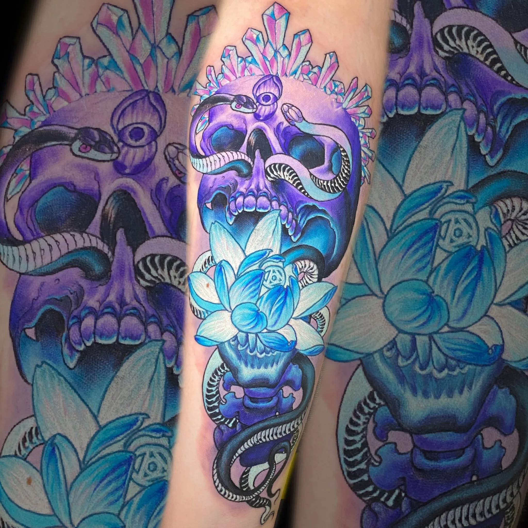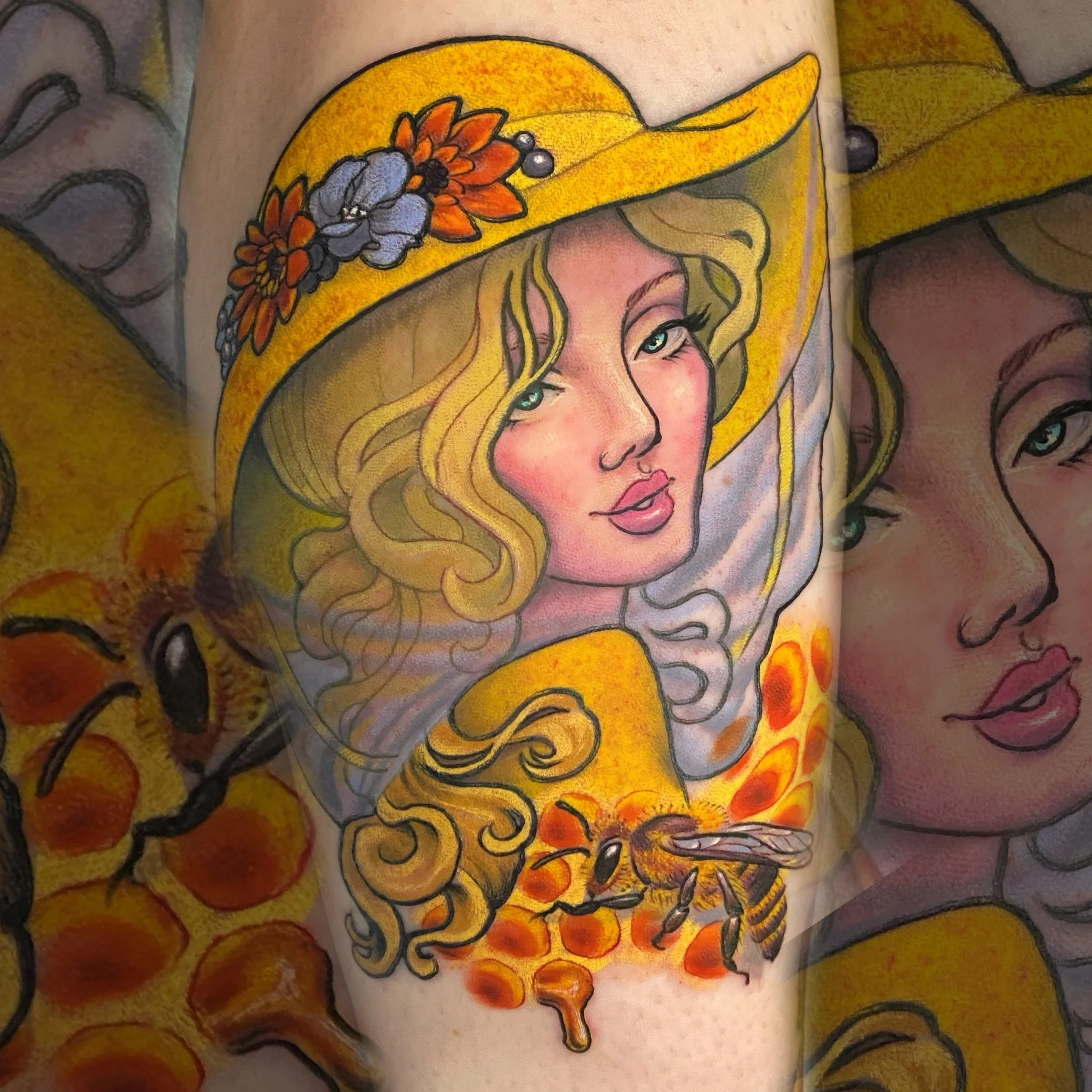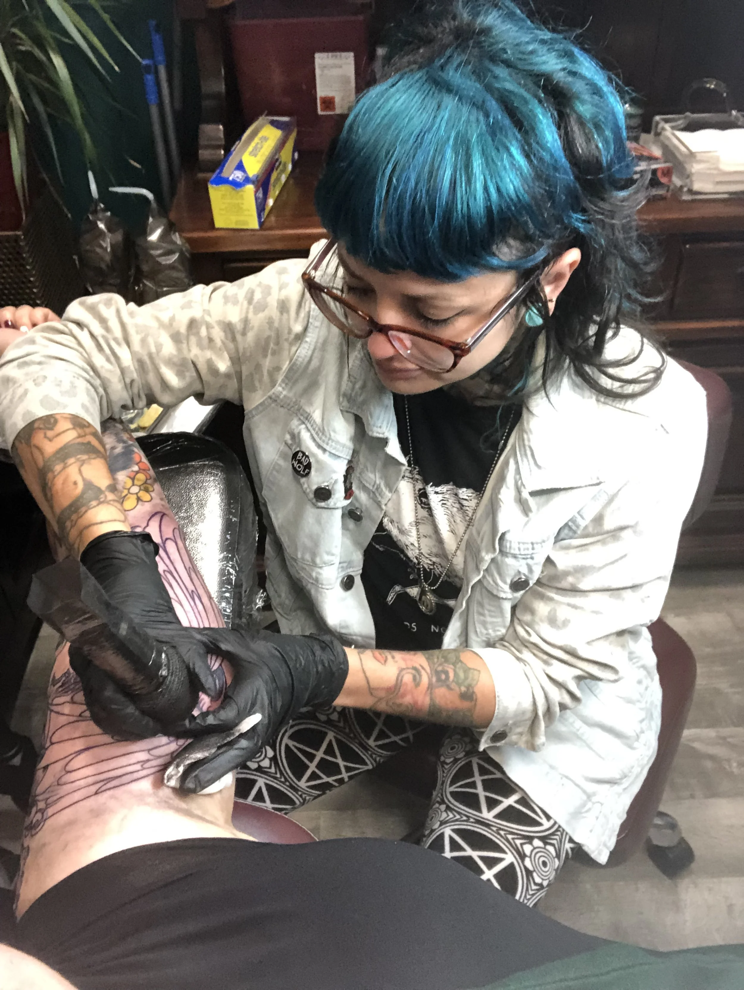 I love tattooing big and bold designs that flow with the body rather than looking like a bumper sticker, colorful or black and grey, art nouveau influenced especially! Some genres I do well: neotraditional tattoos, ornamental tattoos, illustrative tattoos are my specialty, black and grey realism, color realism, and watercolor (although probably not what you might pick up on Pinterest) I’m not likely to take on tattoos with a lot of text or minimalism.